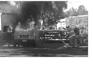 A light blue, mid-1990s Ford pickup truck had caught fire, likely due to an electrical malfunction, and soon the entire cab of the truck was engulfed. Flames shot up 20 feet in the air.