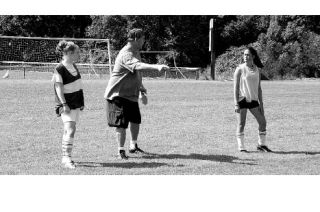 GEARING UP FOR FALL: Vashon High School girls’ soccer Coach Paul Beytebiere sets up a drill with players Teal Sigler, left, and Kalee Abella.