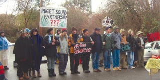 The effort got under way in the pre-dawn darkness, when dozens of Islanders, gathering at the two different sites, set up an extensive operation. The men and women in the hard blockade sat on milk crates, bundled in heavy coats and boots; the two on each end had a steel tube that reached into a drum of cement. Each one sported a blue laminated tag on their coats: “We are nonviolent. We love Puget Sound.”