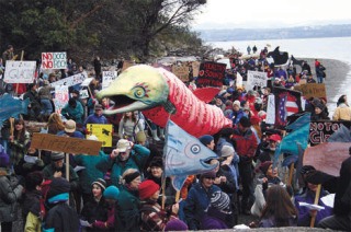 Sunday’s rally was a colorful affair. The procession to the beach was led by Bill Moyer, director of the Backbone Campaign, carrying a snare drum around his neck and hoisting a pole supporting a huge, open-mouthed fish puppet. The hundreds who followed also held an array of signs, some artistic expressions of their opposition. Black-and-white orcas and multi-colored fish undulated in the air above the crowds. Some protesters waved signs taking aim at outgoing Public Lands Commissioner Doug Sutherland, who in the final days of his tenure issued Glacier a 30-year lease to state-owned aquatic lands. Others made simple statements about the state of the Sound: “Go sharks,” a sign by a child said; “Eelgrass,” another proclaimed; “No dock. No rock,” said another.
