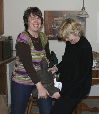 Auction procurer Laura Hansen and PTSA president Denise Katz heft a stone statue of Buddha