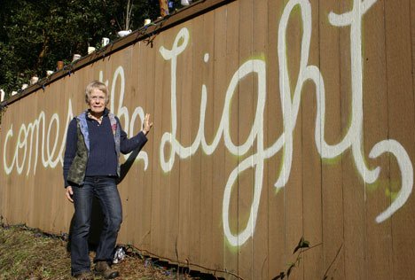 She filled in the letters with a special glow-in-the-dark paint, so the message shimmers in the evening. Outlining the fence are 872 small colored lights. And atop the fence are mugs — some of her own as well as dozens contributed by both friends and strangers — each one carefully adhered so it won’t fall off.