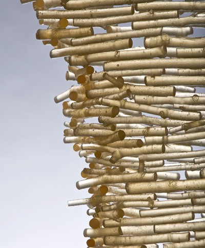 Snyder, who moved to Vashon six years ago, artfully juxtaposes the strength of nature with the fragility of glass as seen in his delicate glass branches and sensuous blown glass leaves. He often creates large pieces with clusters of many small objects, such as “Calling,” a work that evolved from stacking several glass sticks in a conical arrangement.