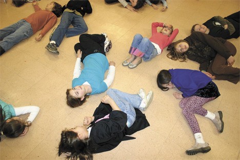 A dozen kids roamed a classroom in slow motion, filling the space around their bodies in creative and contorted ways. Then, at the command of teacher Jim Gilmour, they all melted slowly to the ground, collapsing in human puddles on the floor.