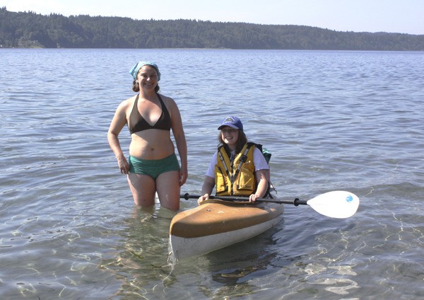 As the mid-day sun beats down on the Colvos Passage, making the softly rippling water shimmer with light, a redhead in a kayak is having a leisurely ride, mostly pulled along by the current. Another young woman, tanner and dark-haired, swims alongside her, chatting and laughing with her companion.