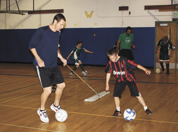 The outdoor soccer fields were dark last Monday night — closed because of heavy rain — but inside the McMurray gym, nearly 30 boys from the Vashon Island Soccer Club were practicing hard, focusing on their foot work. Weaving in and out of the boys, giving instruction and encouragement, were three professional soccer players: Taylor Graham, Roger Levesque and Nate Jacqua, who was leading that part of the night’s practice.