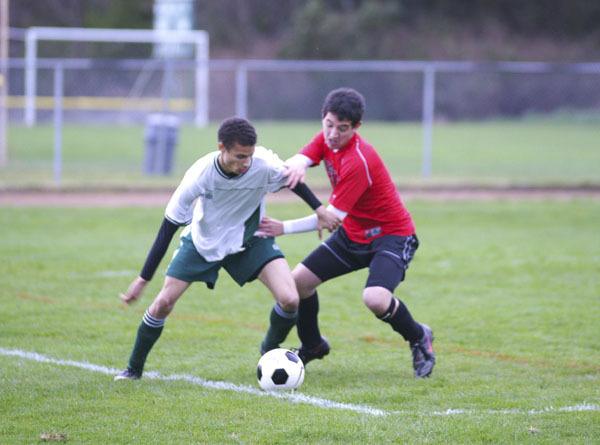 Pirate Nick Fox-Edele, left, battles a Seattle Academy player for possession in last Thursday’s 6-1 victory over the Cardinals on the Vashon field.