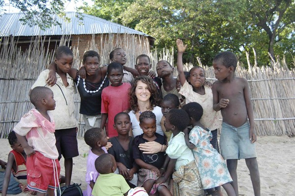 Some of the children of Nkhandwe Village in Malawi surround Olivia Pendergast