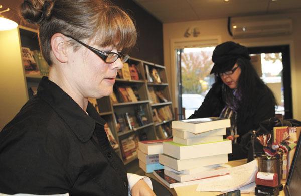 Jenni Wilke sells a stack of discounted books to a longtime customer.
