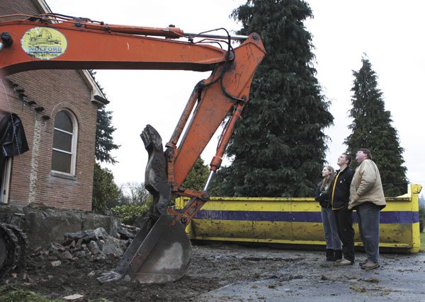 As the workers tore away the front steps of the church, neighbors and former parishioners arrived one by one to bear witness to the proceedings.