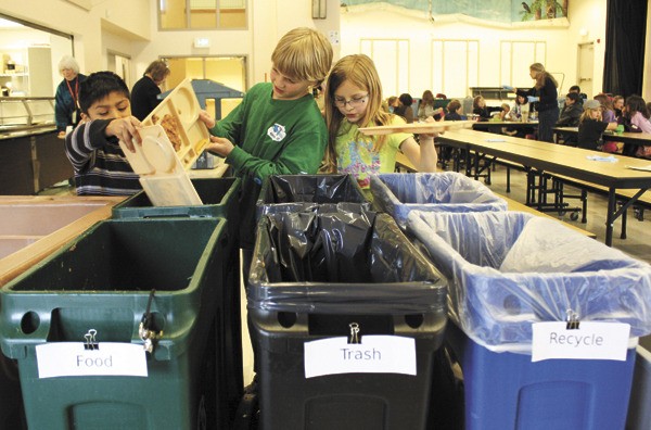 District facilities director Dave Wilke, who is heading up the effort, said that by separating reusable trays, food waste, liquid waste and recyclables, the elementary school has already reduced its lunchtime trash output from about 10 bags a day to just one.