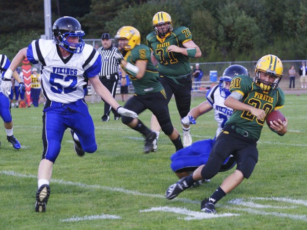 Vashon had a drive featuring two long runs by quarterback Nick Amundsen, a catch by Ezra Lacina and on fourth down a catch by Garrett Starr at the 8-yard line. But Bellevue intercepted a Pirate pass, then Clyde Pruett intercepted a Bellevue pass to end the first quarter.