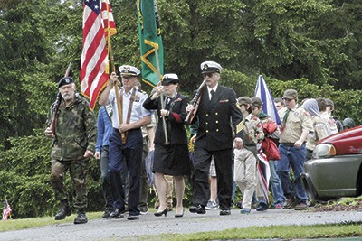 The Color Guard led the procession, followed by members of Boy Scout Troop 294; several islanders representing Vashon organizations placed wreaths at the veterans’ monument, including Ron Garrison , a Gulf War veteran and member of the Veterans of Foreign Wars (VFW). Garrison also spoke on behalf of the VFW. Lisa Devereau read a letter from islander Zach Stackhouse, who is attending The Citadel, and Fire Chief Hank Lipe bottom left delivered the keynote address. The ceremony also included the singing of the national anthem by Vashon High School student Maya McTighe and ended with taps and the retiring of the colors.