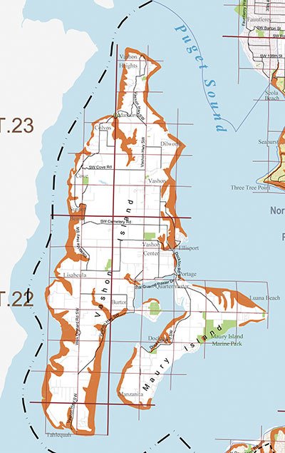 “Vashon is largely surrounded by coastal bluffs,” said John Bethel, a geologist with the county Department of Natural Resources and Parks. “It certainly makes sense that the perimeter of Vashon is prone to landsliding.”