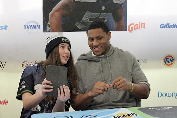 Hundreds of people descended on the Vashon Thriftway last week for a chance to meet Seattle Seahawks linebacker and Superbowl MVP Malcolm Smith. Serious fans began lining up before lunchtime on Dec. 9, and at 2 p.m. Smith set up shop in the store’s lobby as part of a promotion for Proctor & Gamble, with whom he has an endorsement deal. A long line of blue-and-green-clad fans took turns shaking Smith’s hand, getting autographs and taking photos with him.