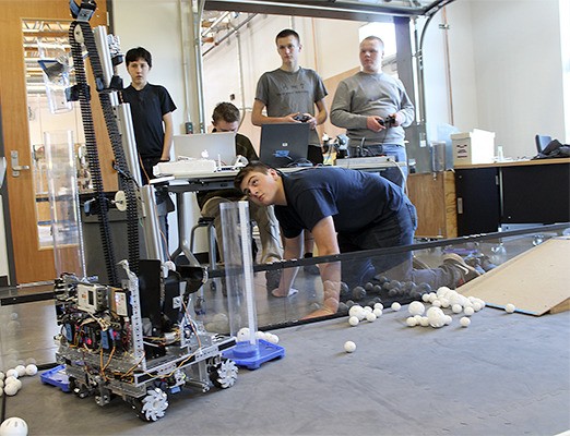 On a recent sunny afternoon, balls could be heard clinking at Vashon High School as baseball players began practice for the spring season. Inside the school building, another group of boys was preparing for competition. But fielding balls for this team was a 3-foot-tall robot covered with wires, pulleys and blinking lights.