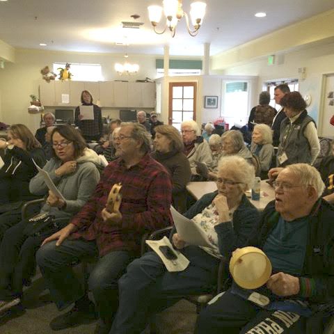 Initially, the weekly sessions were held at the Lutheran church and saw 20 to 25 participants per session — some brought by bus from Vashon Community Care (VCC) and others coming on their own or with family members — with many community and Rotary Club members stepping up to volunteer their services as song leaders and musicians. A well-attended holiday sing-along in December left Huggins with hopes high for the program’s growth.