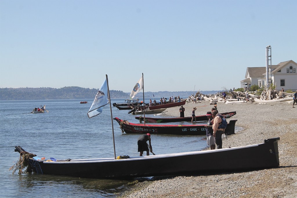 As this year’s journeyers traveled through Puget Sound, the event drew attention due to an overnight canoe stop hosted by the Muckleshoot Nation at Alki Beach last week, and an informal rest stop at Vashon’s Point Robinson on Thursday morning. The Blue Heron was one of roughly a dozen boats that were brought onshore to give pullers a brief break before heading on to Point Defiance.