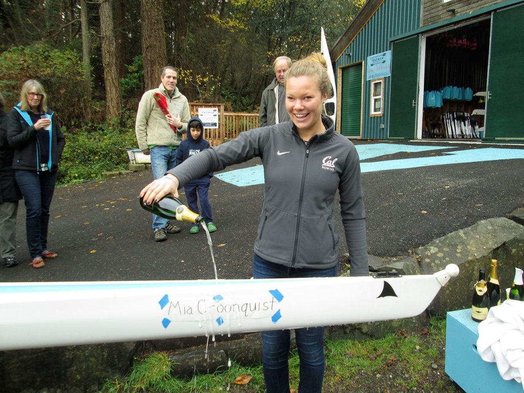 Mia Croonquist, a former Vashon Island Rowing Club rower now excelling on the University of California, Berkeley’s rowing team, christened an eight-person rowing shell with a bottle of champagne at a ceremony Saturday morning. The shell is named after her.