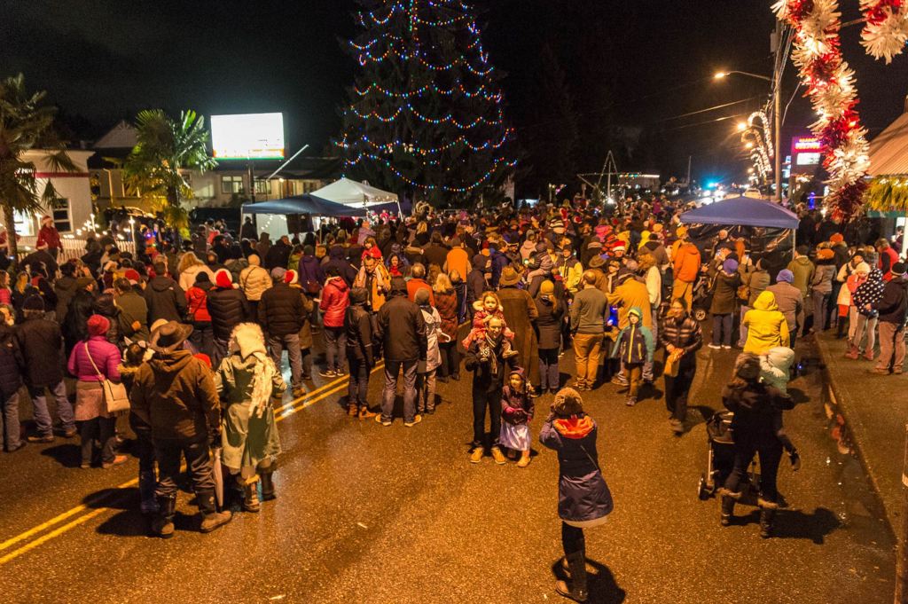 Revelers gather on Vashon Highway in front of the town Christmas tree. (John De Groen Photo)