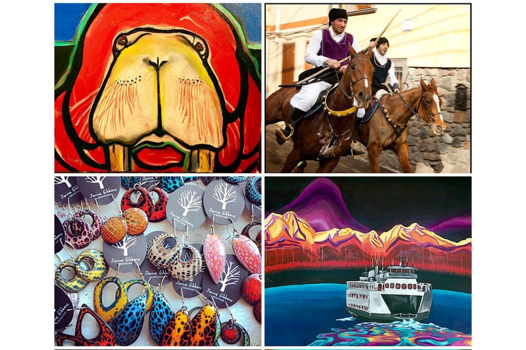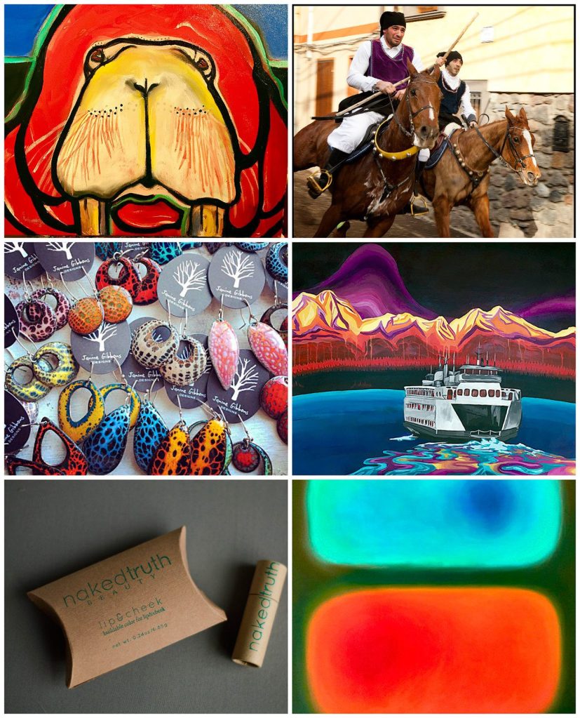 First Friday art clockwise from top left: Walrus painting by Margaret Tylczak Heffelfinger; Helga Jonsson photograph of horseman on the island of Sardinia; ferry painting by Gianna Anderson; “Yin-Yang” painting by Kristen Reitz-Green; cosmetics by Naked Truth; and jewelry by Janine Gibbons.