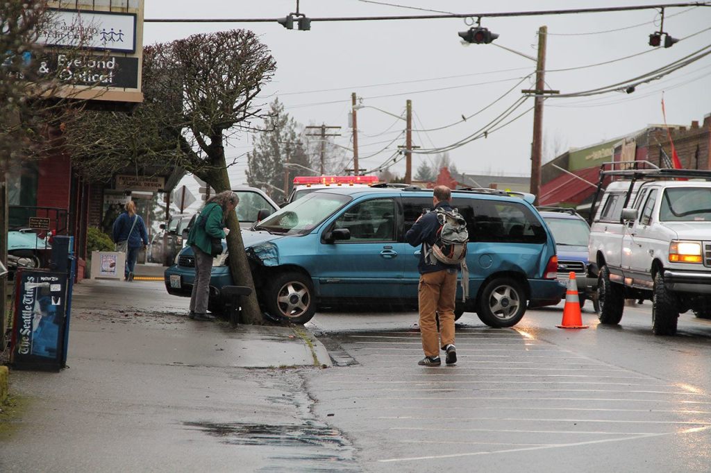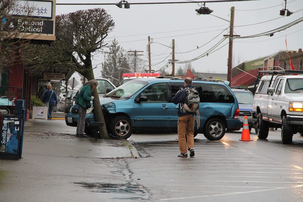 A woman driving a blue minivan crashed into a tree near the intersection of Bank Road and Vashon Highway Friday afternoon. The incident occurred around 2 p.m. and the driver of the vehicle was arrested. King County Sheriff’s Department deputies at the scene said the driver got upset with a pedestrian who, at the time of the crash, was walking north on the sidewalk along Vashon Highway. In an apparent attempt to hit the pedestrian, the driver allegedly made a U-turn in the middle of the highway and headed toward the pedestrian when she hit the tree. The pedestrian fled and was not harmed.
