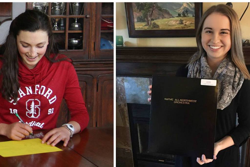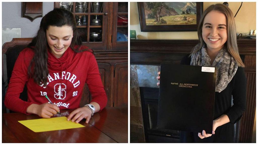 Virginia Miller practices her signature for her college letter of intent at Annie Wright (left); Grace Riggs with her acceptance letter from the NAfME All-Northwest Orchestra (right). (Courtesy Photos)