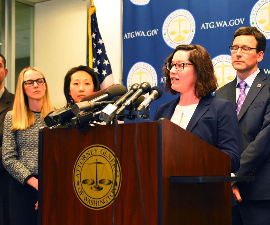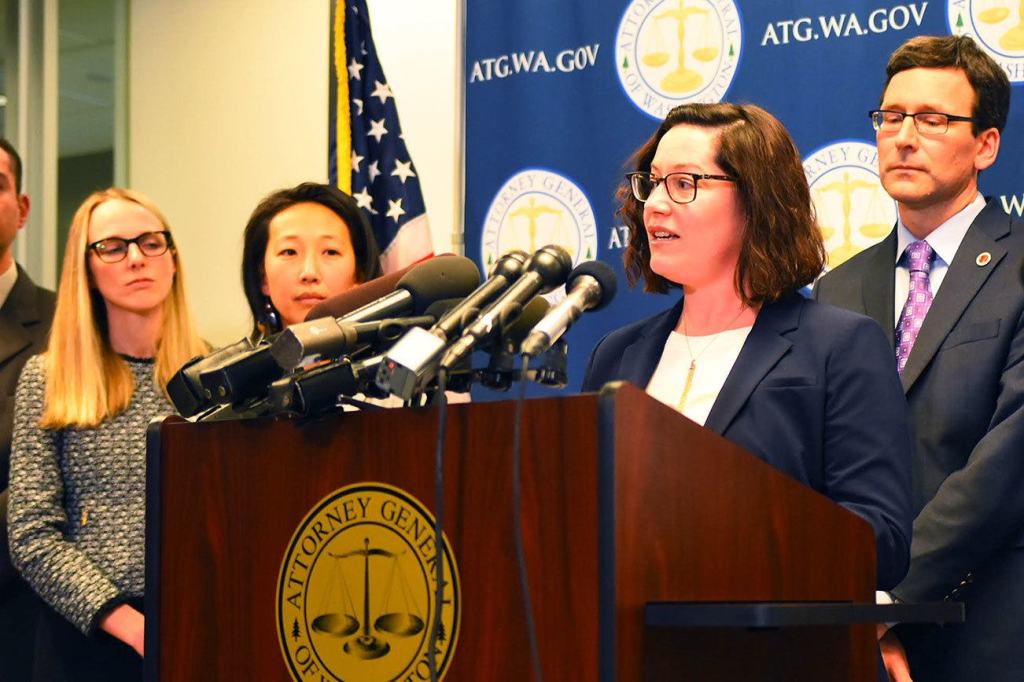 On Monday, Jan. 30, in federal district court, Washington state filed its lawsuit and a motion seeking a temporary restraining order to stop the ban. On Friday, Feb. 3, U.S. District Judge James L. Robart granted the restraining order, blocking enforcement of the ban across the country. Meanwhile, round-the-clock work continued at the Attorney General’s Office. The Department of Justice filed an appeal of the restraining order on Feb. 4 in the Ninth Circuit Court of Appeals, and on Feb. 6, Washington and Minnesota filed a brief, arguing, in part, that the executive order caused irreparable harm to businesses, schools, family relations and state residents’ freedom to travel. On Feb. 7, Justice Department lawyers and attorneys for Washington and Minnesota presented oral arguments to the Ninth Circuit Court. Two days later the court denied the Department of Justice’s bid for an emergency stay, prompting a press conference in Seattle, where Attorney General Bob Ferguson, flanked by staff members, including Melody, called the decision a complete victory for the state of Washington.
