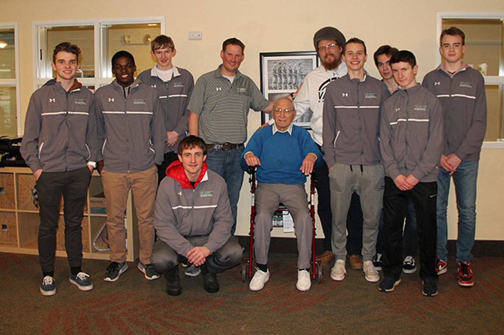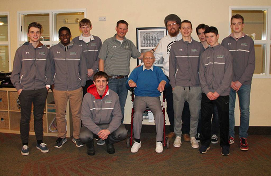 The Vashon High School boys’ basketball team took a trip to Vashon Community Care last week and walked down Memory Lane with a resident while they were there. They met with Paul Schwartz, who played basketball when he was a student at VHS and has a photo of the 1939 team on his wall at the center.