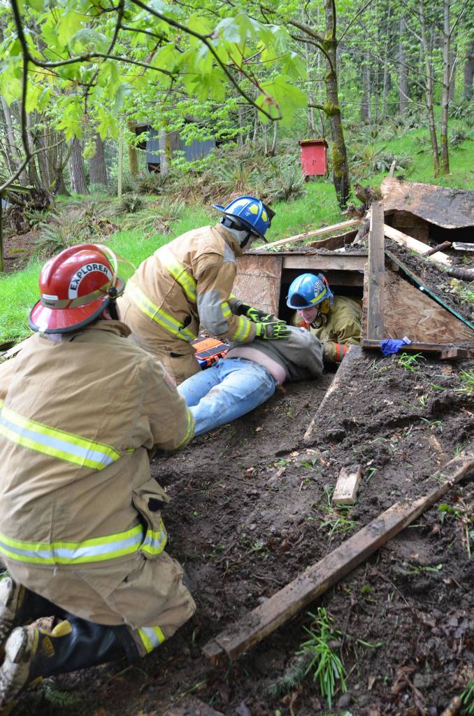 Explorers work together to remove a “victim” from a collapsed structure at the weekend’s Stuck on Vashon event. (Jim Westcott Photo)