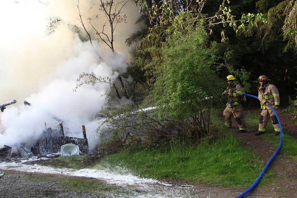 Vashon firefighters were called to a fire at an outbuilding early Sunday morning on Westside Highway. The building was fully engulfed by the time crews arrived and was destroyed by the blaze.