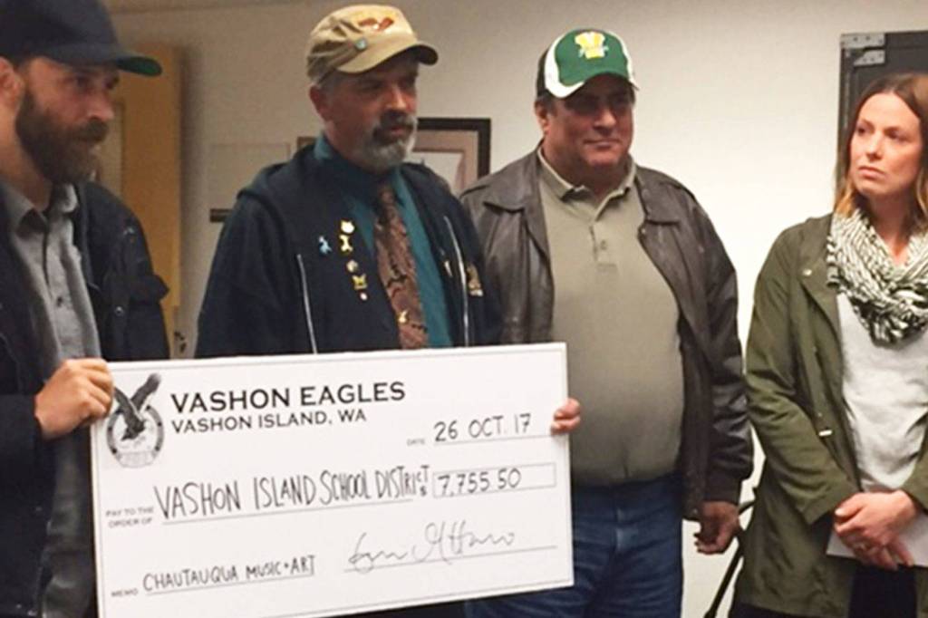 Four members of the Vashon Eagles last Thursday presented a $7,755 check to the Vashon school board — proceeds from the third annual Chautauqua Music Festival.