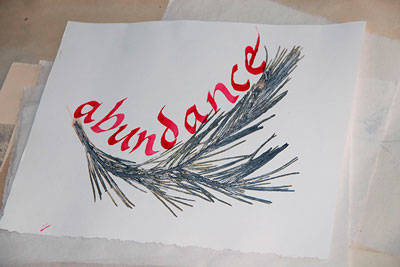 “Calligraphy can transcend the alphabet and words but still be the dance of the brush in color and movement on paper or canvas,” she said. “In my experience, calligraphy has many other dimensions — it’s a concentrated meditation. If you get distracted, you spell a word wrong or leave it out altogether. One must coordinate the golden triangle of heart (emotion, passion, spirit), head (meaning, understanding and memory) and hand (the rhythms and form of the tactile writing) — all of which imprints on a person as they calligraph.”