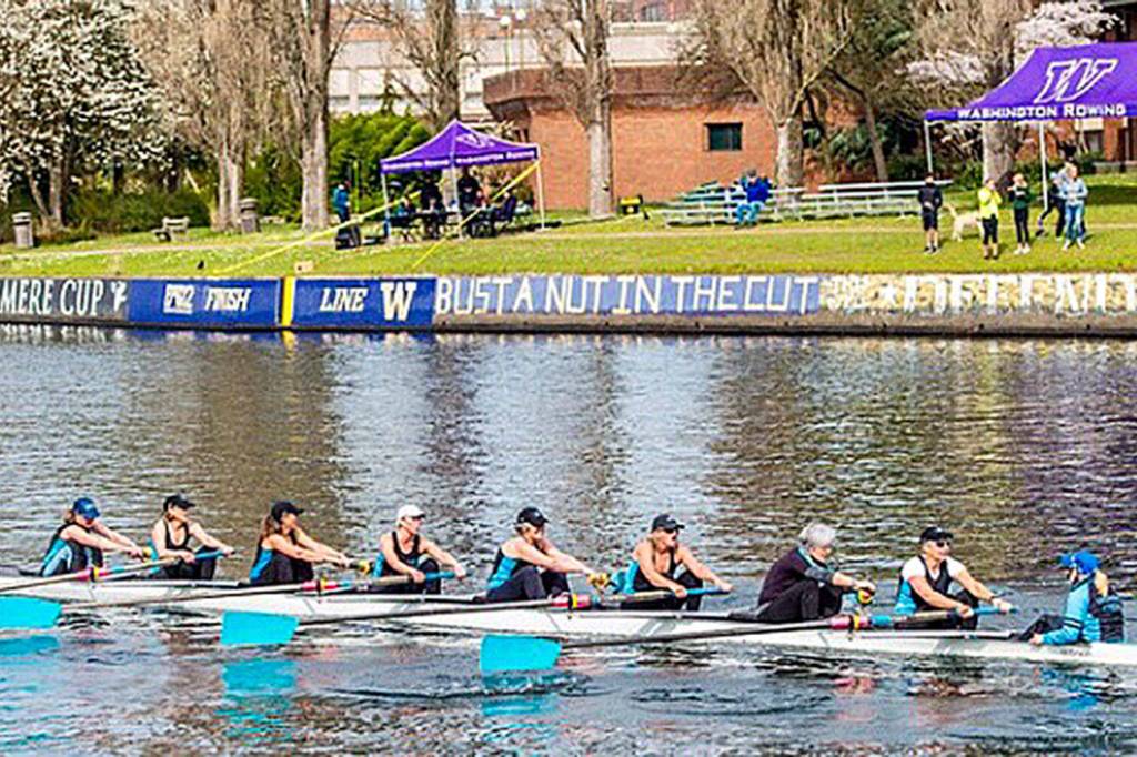 The Vashon Island Rowing Club’s Masters women’s 8 powered to an impressive open-water victory at the Husky Open invitational regatta on Saturday, March 31.