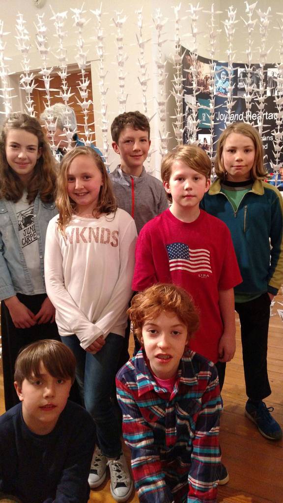 Above, the winners gathered. They are, left to right, Emma Meade, Ava Protzeller, Rowan Marceau-Roache, Aiden Erlandson and River Williams. Kneeling are Enzo Bork and Finley Graham.