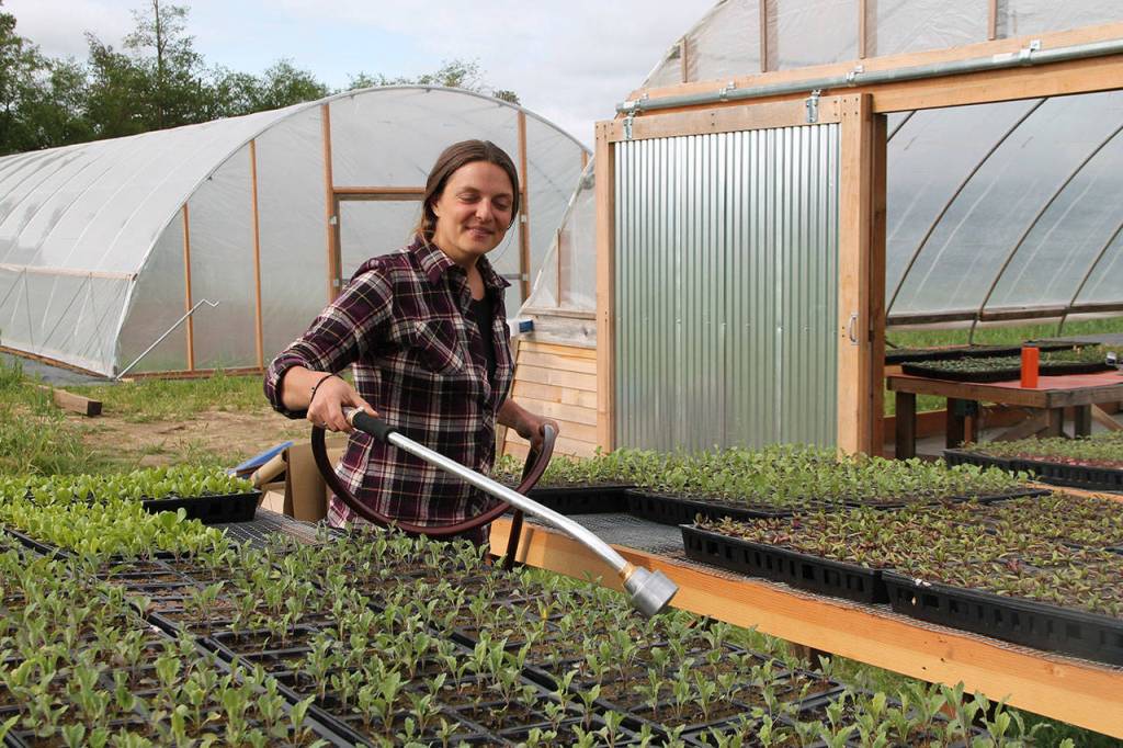 Standing behind a field mottled with sprouts of crimson clover at Matsuda Farm last week, Caitlin Ames guided a hose over dozens of neatly arranged plant starts that will soon yield fresh produce for sale to the Vashon Maury Community Food Bank and Vashon Fresh online food marketplace, which launched last June.