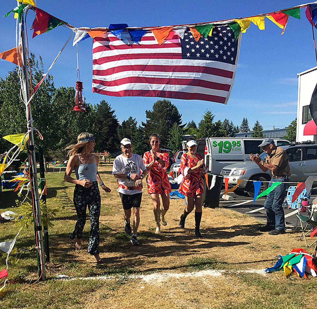 The Dancing Queens at the aid station were joined by Jay Blackburn, who after finishing the 10-mile in seventh place, went out to help and found himself costumed by the Queens — Tara Vanselow, Kathleen Farrell and Meredith Wells. The course trails were expertly prepared by volunteers, King County Parks and the Vashon-Maury Island Land Trust. At the finish, runners relaxed under sunny skies while enjoying delicious food and drink, welcoming in their trail tribe, relating their stories and planning their next trail run.