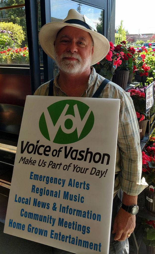 Wallace, who has a background in public relations and radio and TV news, also helped create, develop, manage and fund Voice of Vashon. There he has done everything from helping the station get its first broadcast license to climbing the 81-foot tall water tank to install and maintain the broadcast facilities — often in bad weather.