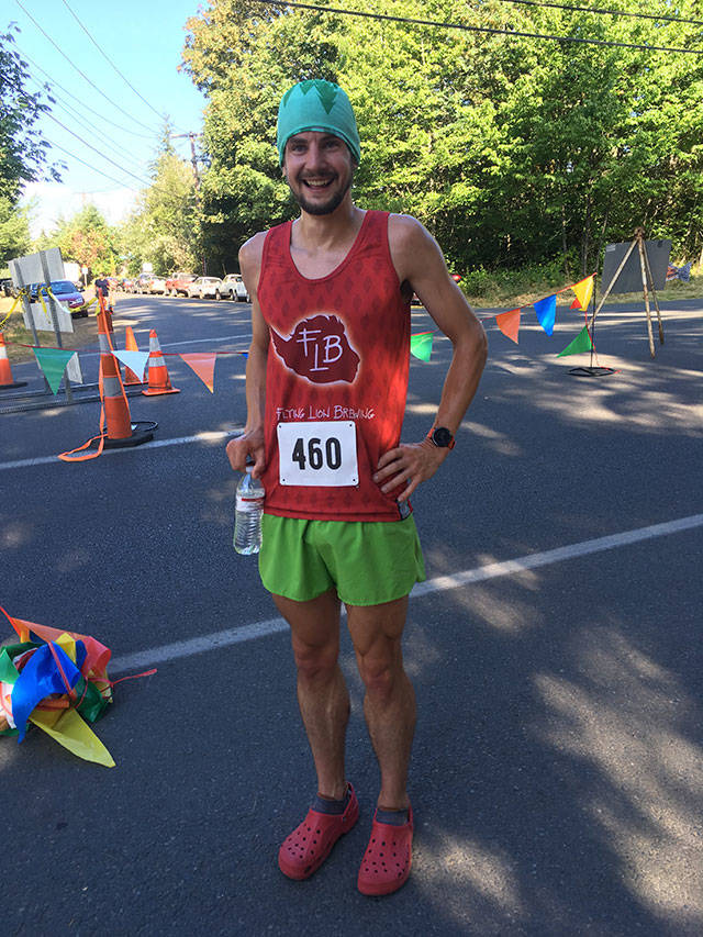 Evan Williams is all smiles after winning the 10k on Saturday, dressed as a strawberry and wearing Crocs (Mary Margaret Briggs Photo).