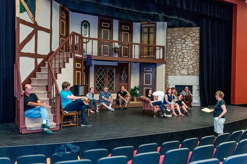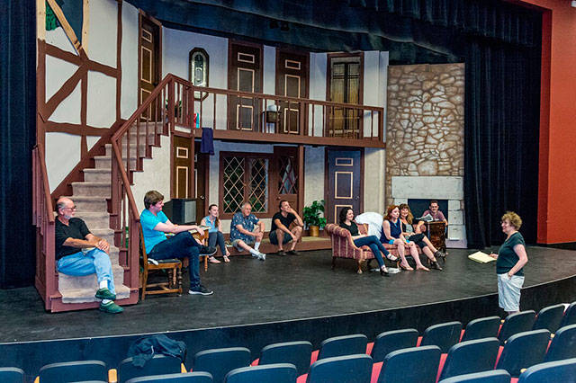 Drama Dock’s two previous summer shows — “Chicago,” in 2016, and “Little Shop of Horrors,” in 2017, were performed at Vashon Center for the Arts. But this year, Hanson said, it has been great to have the option to perform at the 265-seat Vashon High School theater. Indeed, Hanson said, she was only able to bring “Noises Off” to Vashon because of the availability of the high school theater — a space that allowed for the long rehearsal process and the early construction of the set. With school out for summer, Drama Dock’s cast has been in residence in the air-conditioned performance hall since mid-June, clamoring up and down the set’s multiple staircases and perfecting the enactment of a hilariously imperfect play.