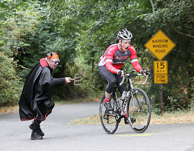 Of course, the main topic of conversation at the post-ride barbecue will always be the hills. Vashon has some doozies, such as parking lot hill at the north end (dubbed “The Wall”), the two climbs that branch off at the bottom of Ellisport (lovingly nicknamed “The Evil Twins”), and then there’s Burma Road, a deceptively steep, up-and-down-and-up-again rollercoaster that ends with a celebratory dose of encouragement from the devil himself, played for the sixth straight year by Vashon Chamber of Commerce Executive Director Jim Marsh.
