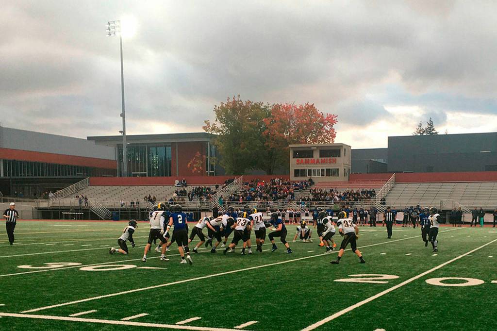 The VHS football Pirates on the field with the Bellevue Christian Vikings last Saturday (Courtesy photo).