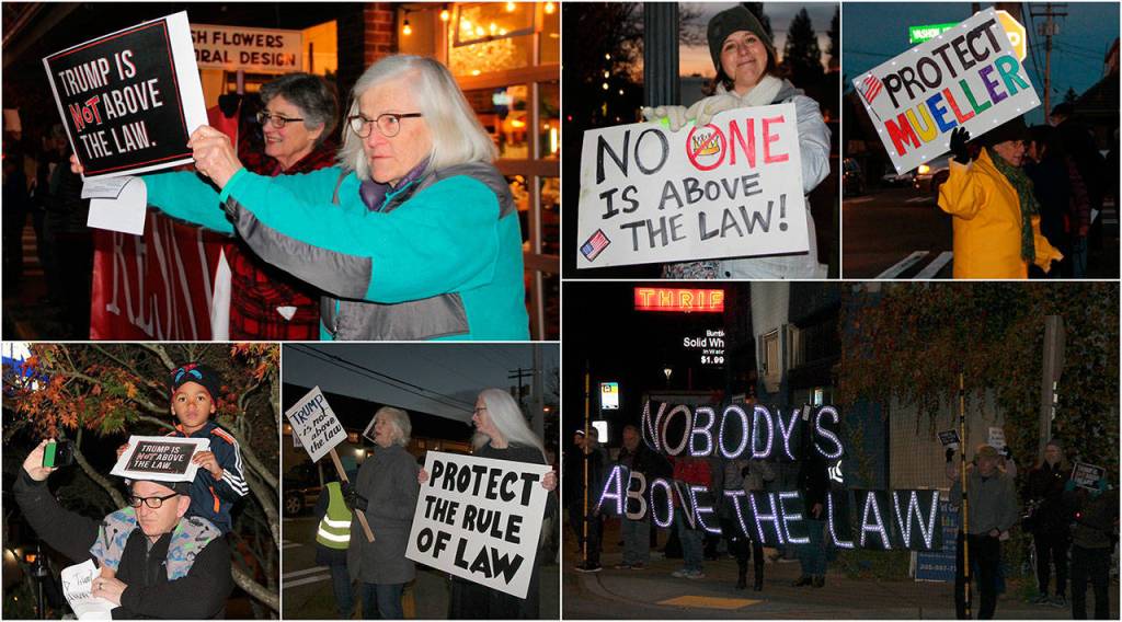 The fliers were provided by islander Kevin Jones, a political activist on Vashon, who organized the event to coincide with national demonstrations. At a microphone outside The Hardware Store Restaurant, Jones told the crowd that the president had “crossed a line” in firing former attorney general Jeff Sessions, adding that Whitaker has said that the Mueller probe is an overreach, as he wrote in an op-ed for CNN last year.