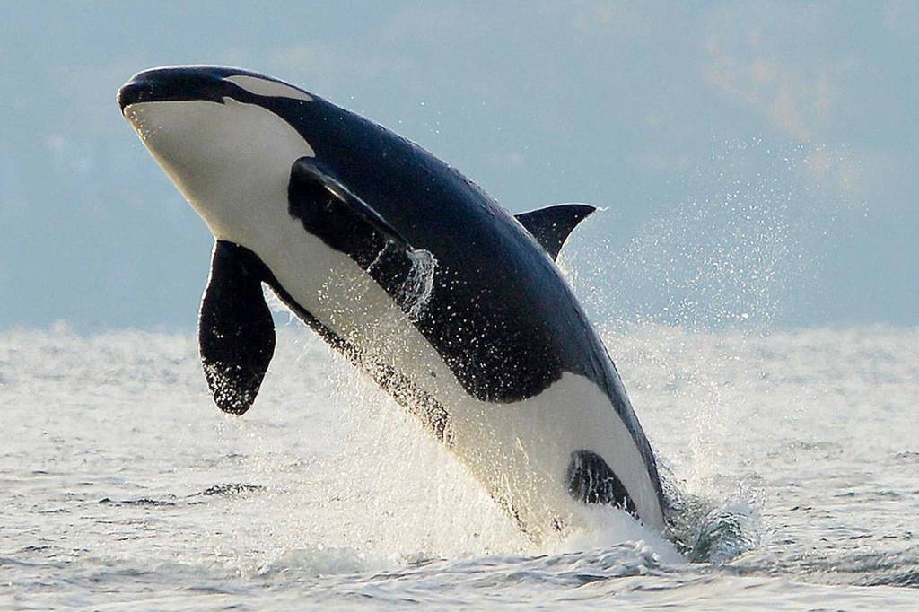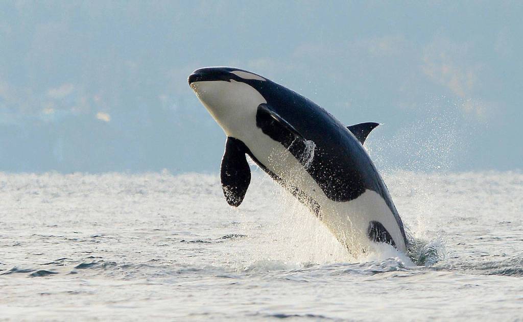 Above, southern resident Alki (J36) breaches near Vashon on Nov. 8.