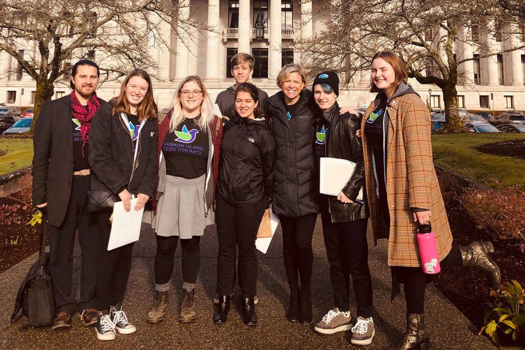Members of Vashon’s Teen Council, with facilitators Kyle Britz and Tracy McLaren, at the state capitol last week. (Courtesy photo)