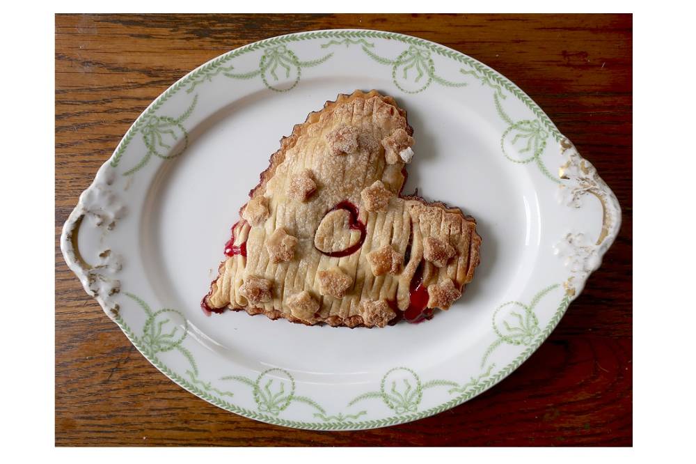 Combine leftover dough, reshape dough into a round and roll out again. Cut out remaining hearts. Divide the number of hearts in two; half will be the bottom crust and half will be the top crust.