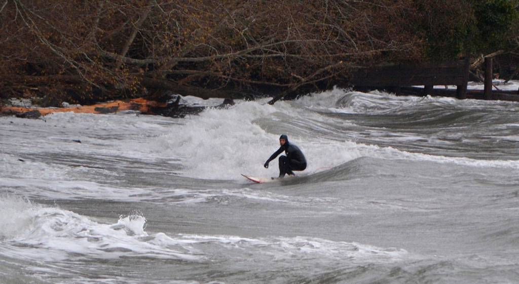 On Monday, when many islanders headed for a sledding hill or found a warm spot in front of a fire, islander Oli Christophersen went surfing. His choice of location: west of the north-end ferry dock. Christophersen said he learned to surf in Washington years ago and has come to love cold waves. With no power at work, he noticed the north wind while he was driving around checking out how much snow there was.