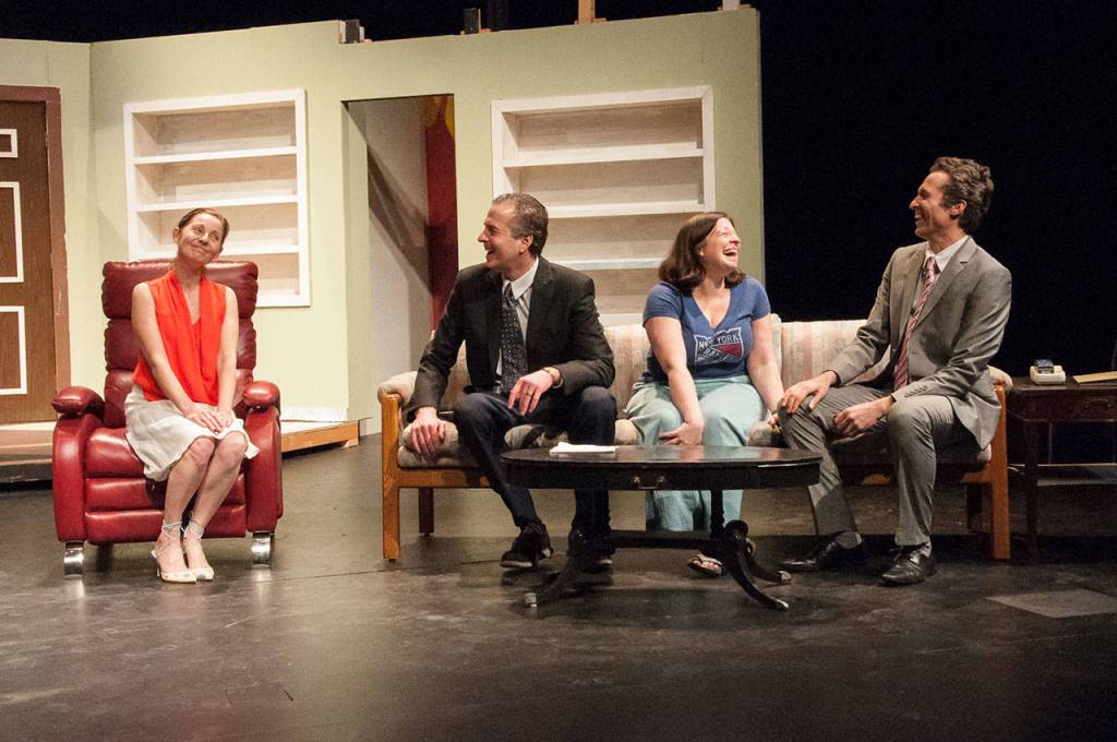 In Drama Dock’s production of “The Odd Couple,” Florence (Dedra Dakota) and Olive (Cate O’Kane) welcome their neighbors, the debonair Costanzuela brothers, Manolo (James Norton) and Jesus (Russell Baker). (Peter Serko Photo)