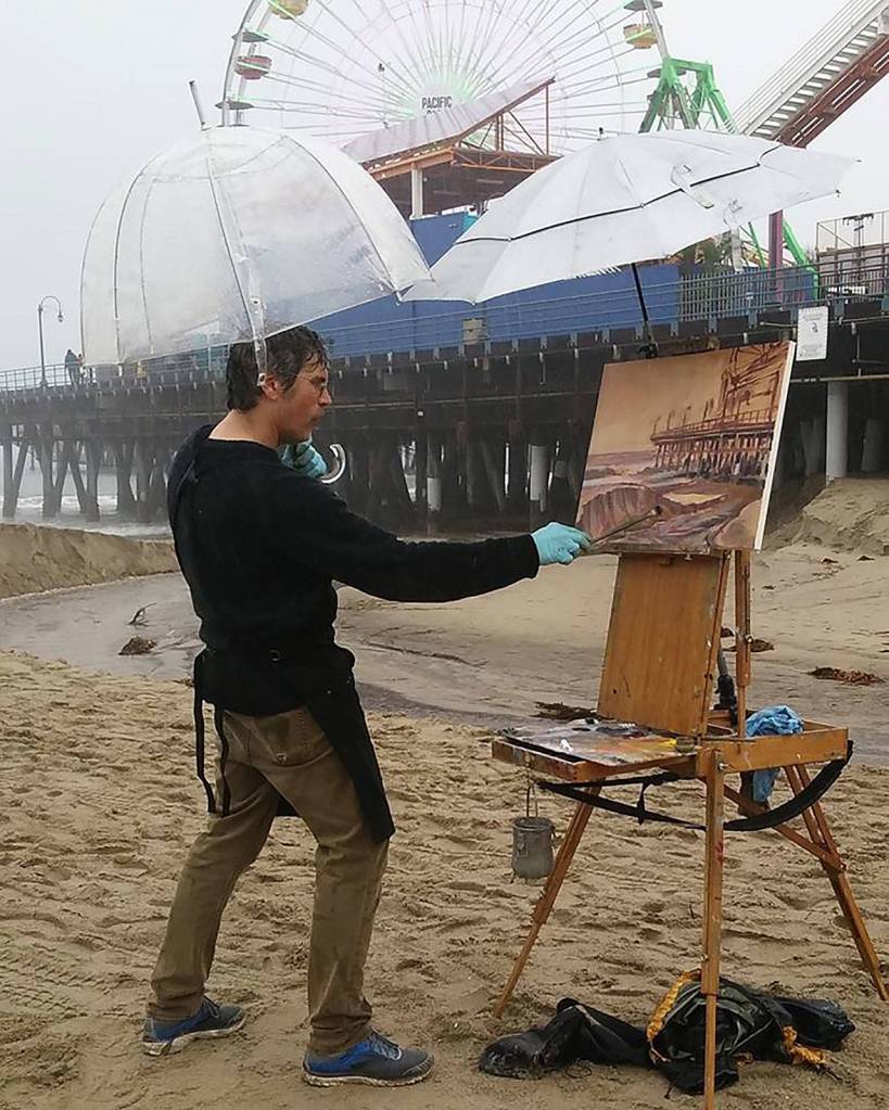 Steffon Moody, shown here painting in the rain at the Santa Monica Pier, will have his third annual solo show at The Hardware Store Restaurant Gallery (Courtesy Photo).