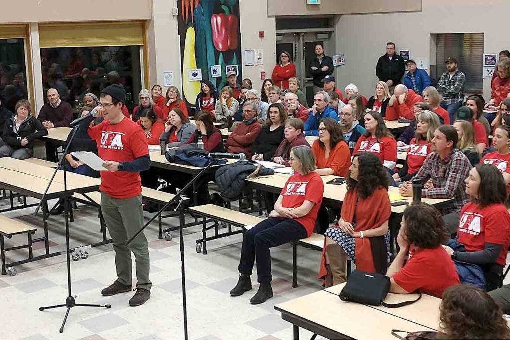 More than 100 island educators and community members filled the lunchroom Feb. 28 at Chautauqua Elementary School, where several spoke out against the recently proposed budget cuts the Vashon Island School District is considering implementing next year.